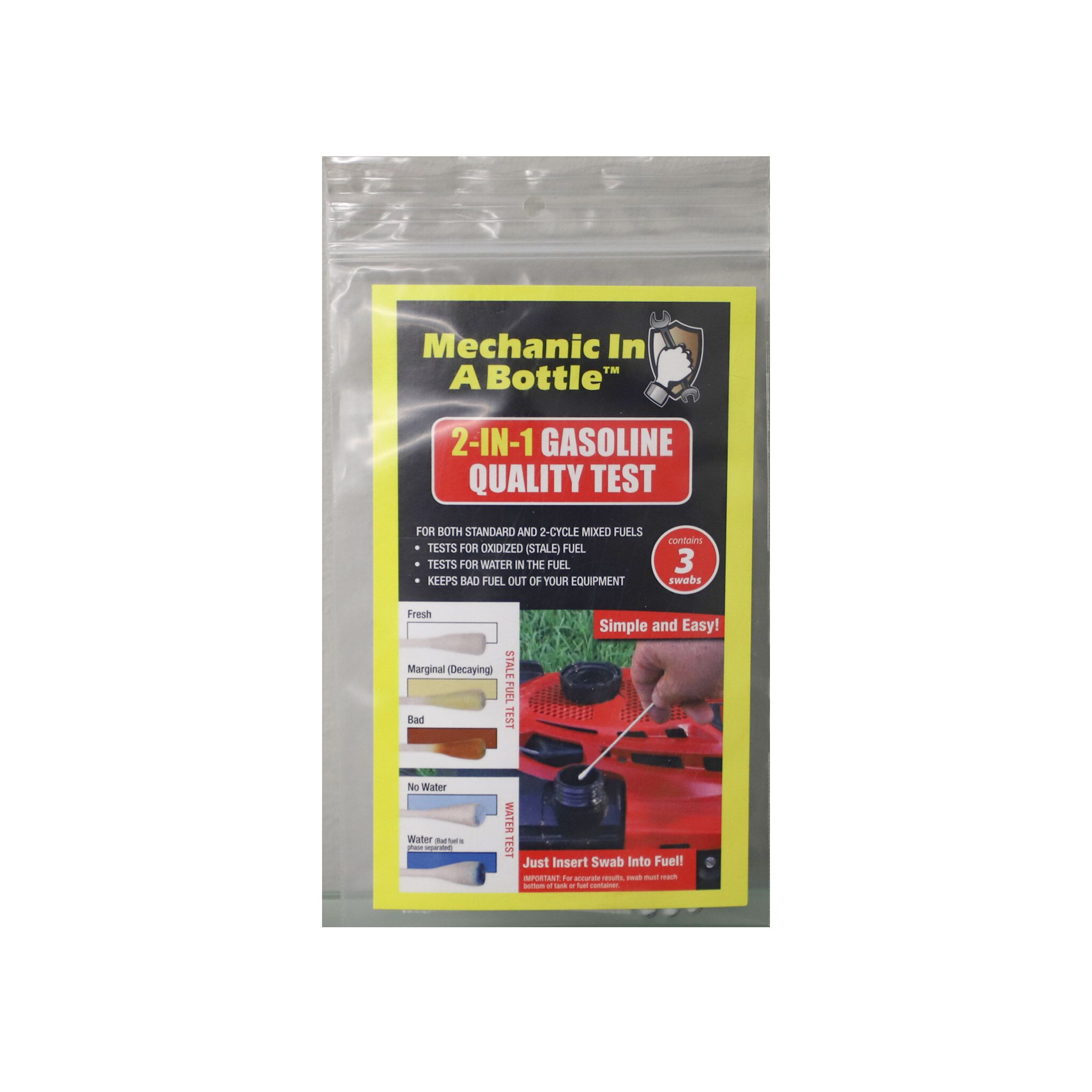 Test for bad gas! Simply dip a 2-in-1 test swab in your fuel tank and check the test chart to determine your fuel quality and see if you have water contamination.