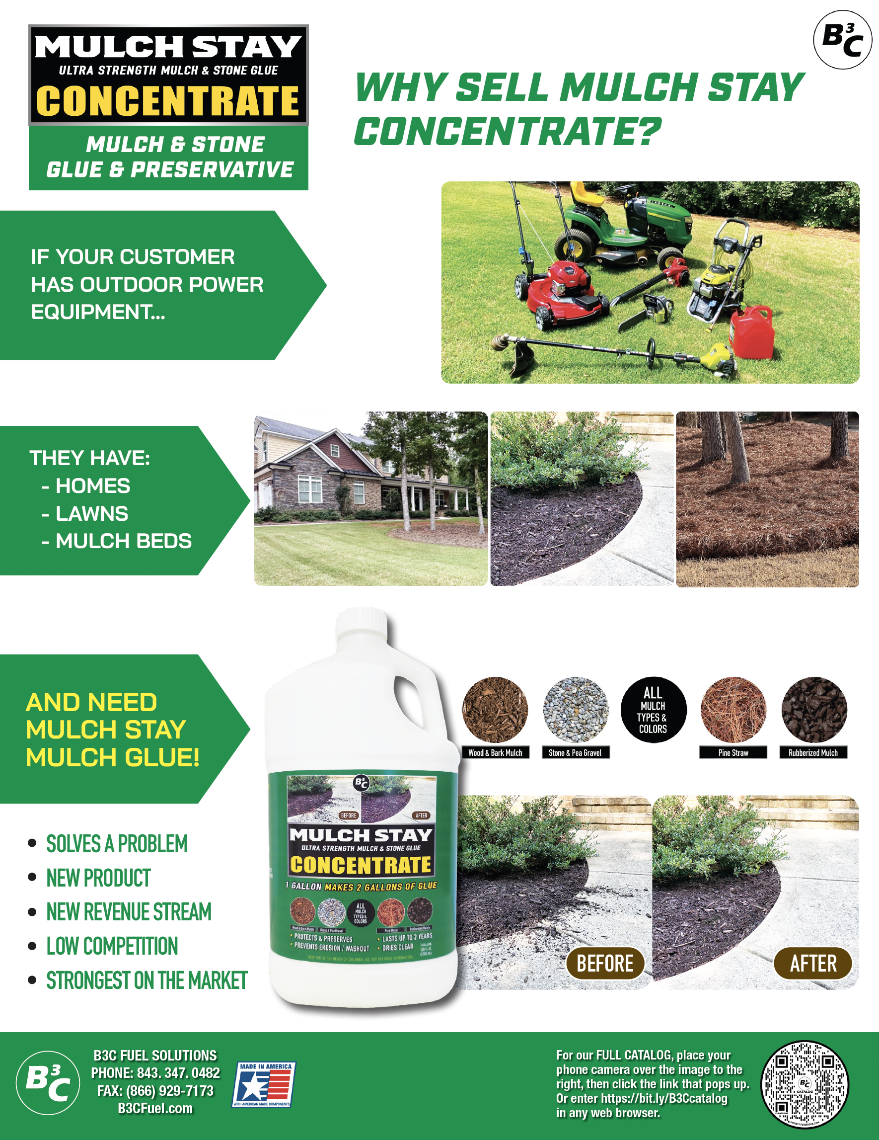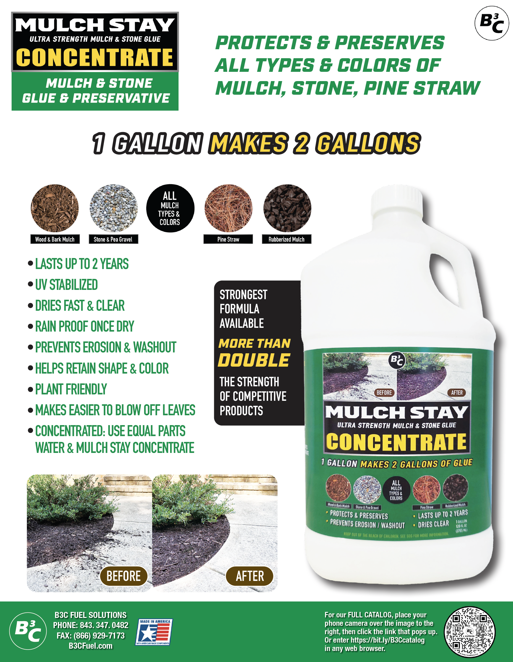 Just mix equal parts of water and concentrate to make Mulch Stay Mulch Glue! B3C’s MULCH STAY binds and locks down mulch, stone, pine straw, sand and more. It preserves mulch so it lasts longer. It is the strongest and most advanced mulch and stone glue available. More than twice as strong as competitive products, MULCH STAY is ready to use out of the container. In fact, we do not pre-dilute MULCH STAY due to added solids in the formula. Formulated with more solids, it is like comparing thin, cheap, water diluted wall paint that needs multiples coats versus a premium thicker paint with one-coat coverage.
